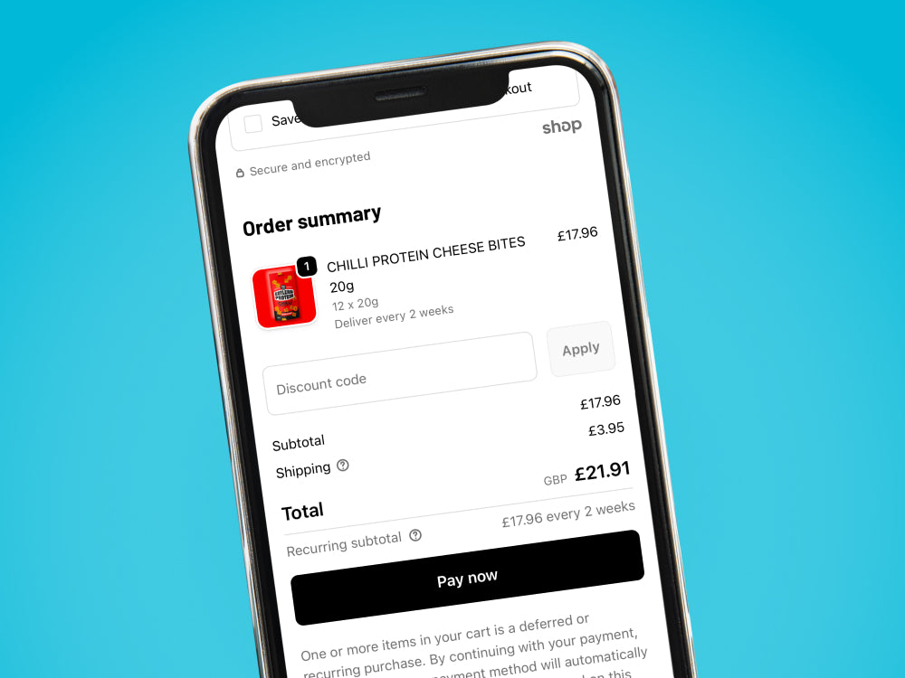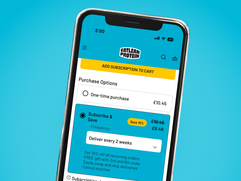 Visit any Eatlean Protein product page and select ‘Subscribe & Save’ to add a subscription order to your basket, and save 10% on every recurring order.